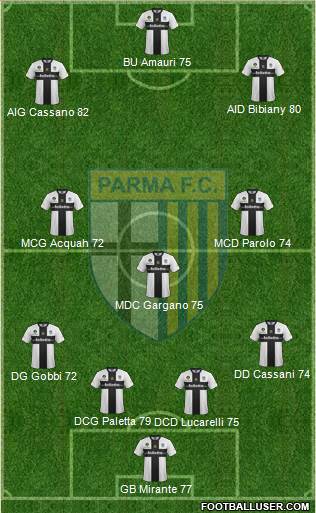 7Biabiany · 11Amauri · 99Cassano · 30Acquah · 16Parolo · 5Gargano · 3Molinaro · 2Cassani · 29Paletta · 6A. Lucarelli · 83Mirante