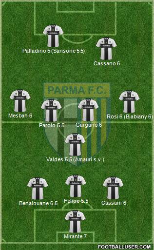 21Sansone · 99Cassano · 18Gobbi · 7Biabiany · 30Acquah · 16Parolo · 32Marchionni · 2Cassani · 6A. Lucarelli · 29Paletta · 83Mirante