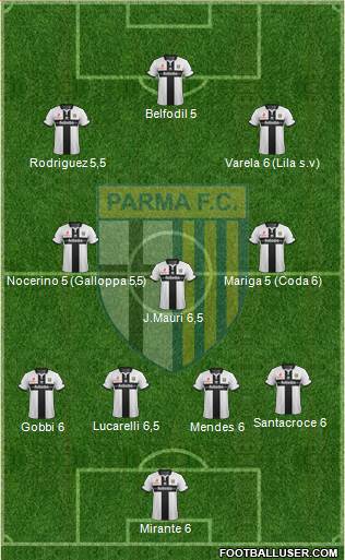 Mirante 5 · Mendes 5 · Lucarelli 5 · Gobbi 4 · 5 · Cassani 5(Santacroce 4 · 5) · Lodi 4 · 5(Mariga 5 · 5) · Lila 6 · Nocerino 5 · 5 · Varela 5 · Belfodil 4 · 5 · Palladino 4 · 5