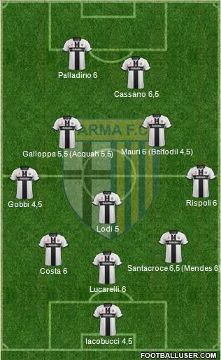 Mirante 6 · Paletta 5.5 · Costa 5.5 · Lucarelli 5.5 · Lodi 5 (Mariga 6) · Gobbi 5 (Pozzi 5.5) · Rispoli 6 · Mauri 5.5 · Nocerino 6 (Palladino 6) · Bidaoui 5 · Cassano 5