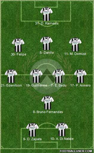 9- D. Zapata · 10- Di Natale · 8- Bruno Fernandes · 17- P. Armero · 21- Edenílson · 19- Guilherme · 7- E. Badu · 75- T. Heurtaux · 11- M. Domizzi · 5- Danilo · 31- O. Karnesis