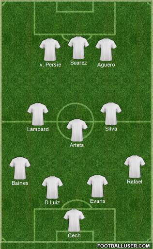 Cech · D.Luiz · Evans · Baines · Rafael · Arteta · Lampard · Silva · v. Persie · Aguero · Suarez