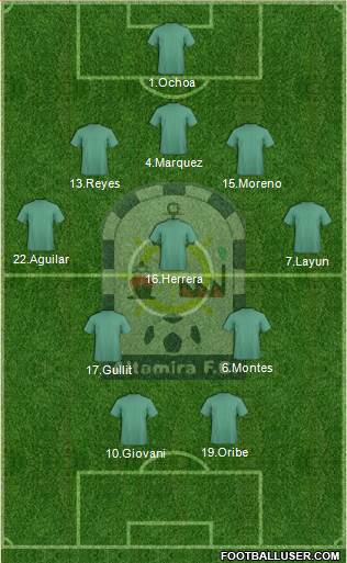 1.Ochoa · 4.Marquez · 13.Reyes · 15.Moreno · 22.Aguilar · 7.Layun · 16.Herrera · 6.Montes · 17.Gullit · 19.Oribe · 10.Giovani