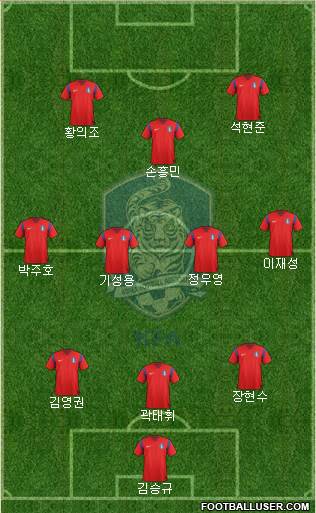 김승규 · 김민재 · 권경원 · 장현수 · 김민우 · 고요한 · 구자철 c · 이재성 · 권창훈 · 손흥민 · 황희찬
