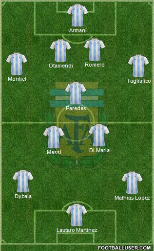 1. Emiliano "Emi" Dibu Martinez (GK) · 3. Lisandro "Licha" Martinez (CB) · 4. Nicolas Otamendi (CB) · 5. Gonzalo Montiel (RB/CB) · 2. Marcos Acuña (LB/LW) · 6. Leandro Paredes (CM/CDM) · 7. Enzo Fernandez (CM) · 8. Mac Allister (LM/CM/CAM) · 11. Di Marìa (RM/RW) · 10. Lionel Messi (CF/CAM) · 9. Julian Àlvarez (ST/LW)