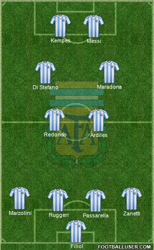 Romero · Milito · Burdisso · Rojo / Zanetti · Zabaleta / Zanetti · Mascherano · Cambiasso · Pastore · DiMaria / Tevez · Messi / Tevez / Agüero · Higuaín
