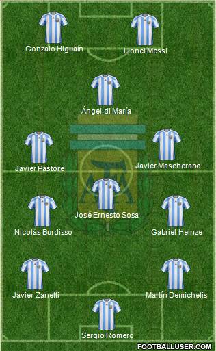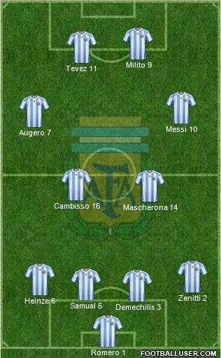 S.Romero · N.Burdiso · W.Samuel · M.Demichelis · G.Heinze · J.Veron · J.Mascherano · A.Di.Maria · C.Tevez · L.Messi · G.Higuain