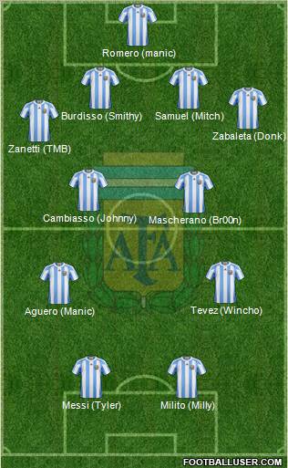 S.Romero · Samuel · demichelis · Zanetti · Heinze · Mascherano · Pastore · Maxi · Messi · Tevez · Aguero