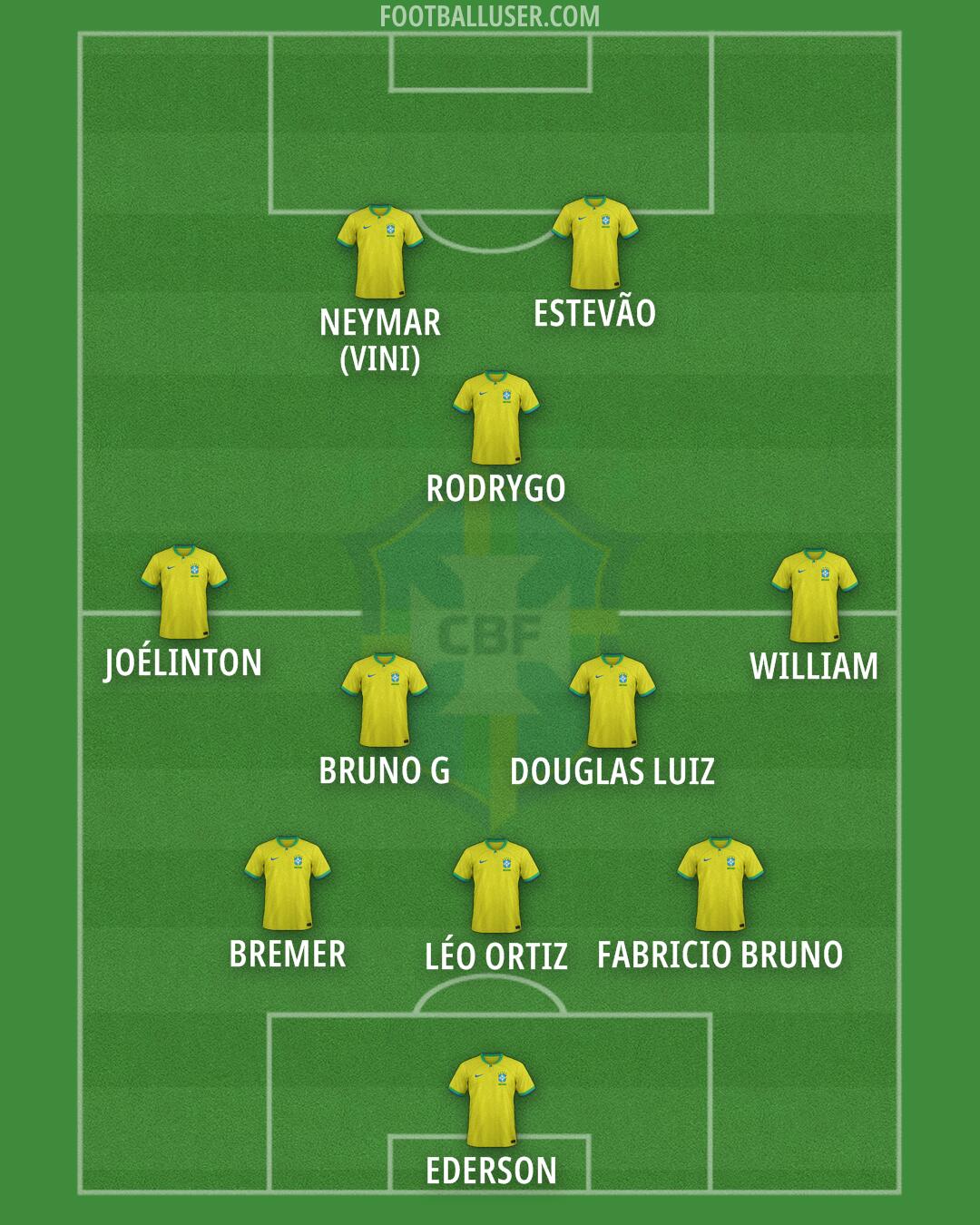 A.Becker · Marquinhos · Casemiro (C) · Alex Sandro · Vanderson · Murillo · Gerson · Bruno (Guimaraes) · Vini Jr. · Antony · Matheus (Cunha)