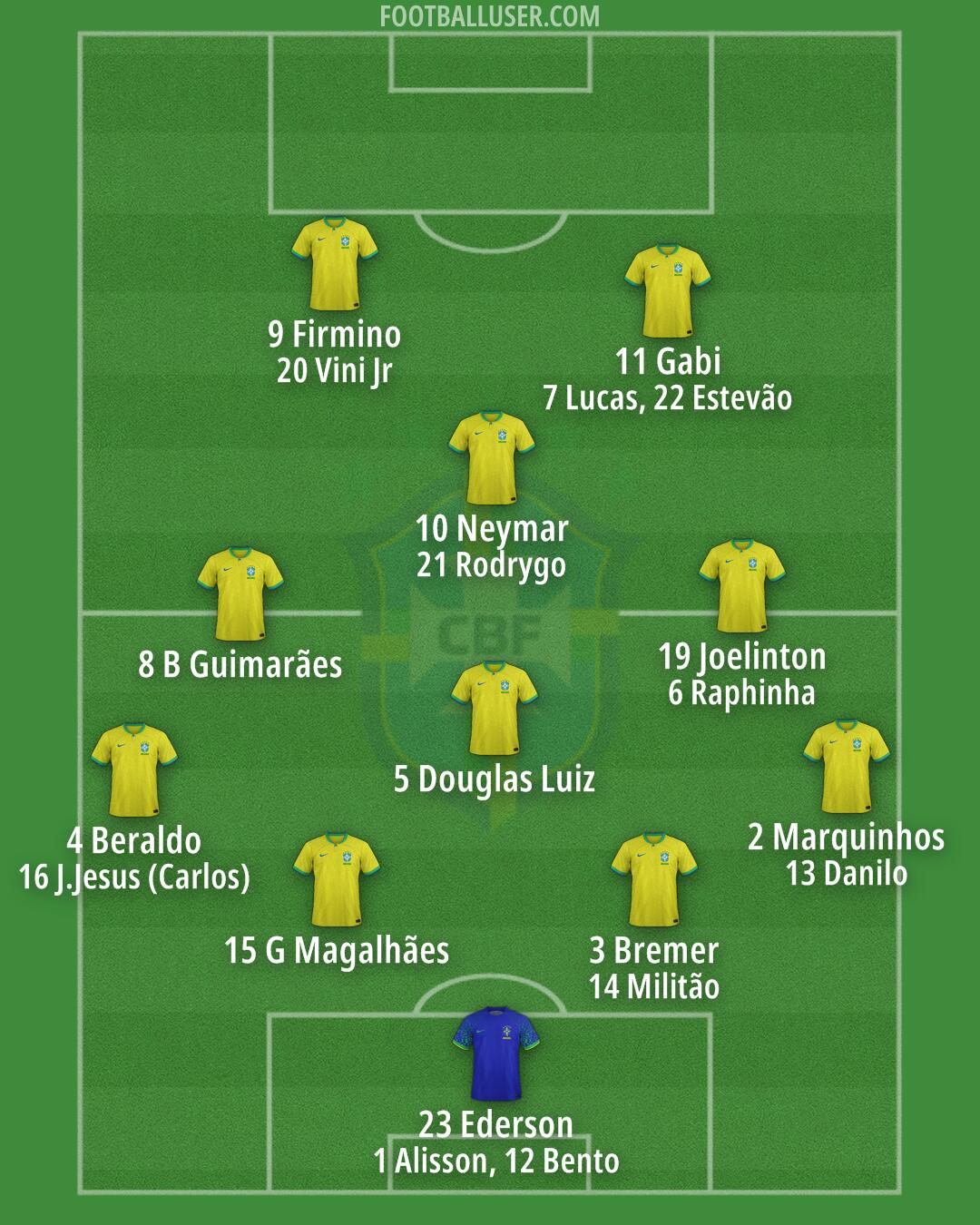 Alisson · Casemiro · Bruno Guimarães · Paquetá (Gerson/Ederson) · Raphinha (Neymar/Estevão) · Rodrygo (Endrick/Matheus Cunha) · Marquinhos (Bremer) · G. Magalhães · Militão · Vini Jr. · Caio Henrique (C. Augusto/S. Lino)