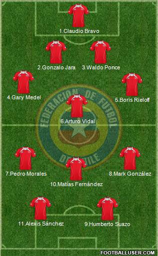 9.Suazo/19.Muñóz · 7.Alexis S./21.Felipe G. · 15.Beausejour/22.Paredes · 4.Isla/20.Millar · 14.Matias Fdz/11.Jiménez · 8.Vidal/13.Estrada · 17.G.Medel/10.Valdivia · 5.Contreras/2.Silva · 18.Jara/6.Carmona · 3.Ponce/16.Fierro · 1.C.Bravo/12.M.Pinto/23.Garcés