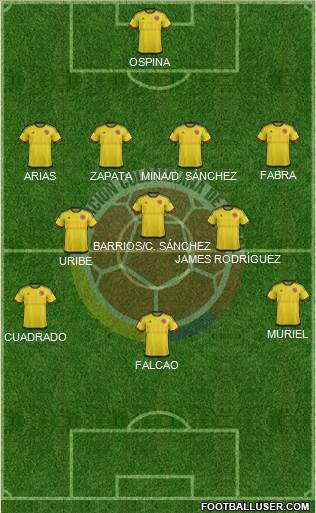 Ospina · D.Sanchez · Mina · Arias · Mojica · Barrios · C.Sanchez · Quintero · Cuadrado · Izquierdo · Falcao