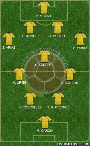 Ospina (Arsenal) · Mina (FC Barcelona) · Sanchez (Totenham) · Arias (PSV) · Fabra (Boca Juniors) · Barrios (Boca Juniors) · Sanchez (Espanyol) · Rodriguez (Bayern Munich) · Cuadrado (Juventus) · Cardona (Boca Juniors) · Falcao (Monaco)