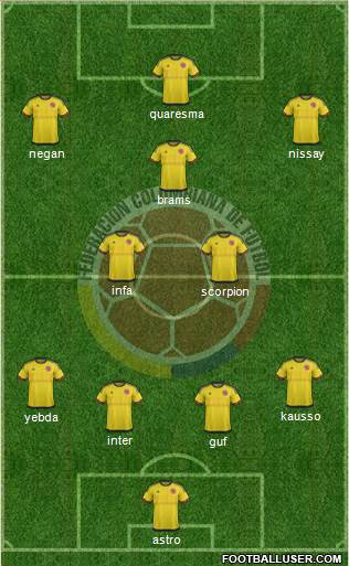 P.Zape / C.Sanchez · I.R Cordoba/ A.Escobar · M.Yepes · P.Armero/ Diego Osorio · Chonto Herrera · Freddy Rincon/Leo Alvarez · Pibe Valderrama · Cuadrado/Tino Asprilla · James Rodriguez · Willington Ortiz/Iguaran · Falcao