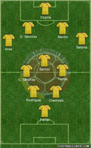 Ospina · Murillo · Balanta · Fabra · Arias · Sánchez · Guarín · Cuadrado · James · Bacca · Falcao