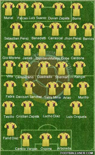 Zapata · James · Cuadrado · Carrascal · Uribe · Campuzano · Mojica · Arias · Mina · Sanchez · Ospina