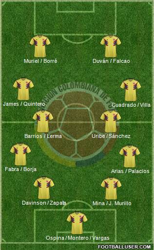 Ospina · Mina · Davinson · Tesillo · Medina · Barrios · Quintero · James · Cuadrado · Falcao · Duvan