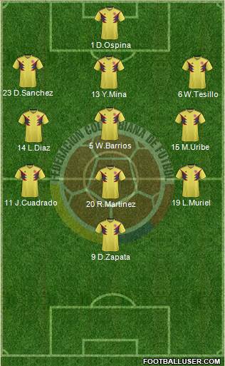 Ospina · Arias · Mina · Sanchez · Mojica · Barrios · Cuadrado · Uribe · Quintero · Bacca · Falcao