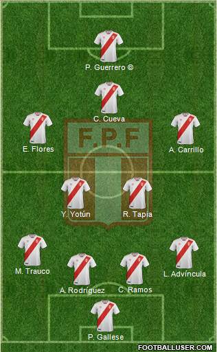 Pedro Gallese · Christian Ramos · Anderson Santamaría · Luis Advíncula · Miguel Trauco · Yoshimar Yotún · Renato Tapia · Edison Flores · Christian Cueva · André Carrillo · Raúl Ruidíaz