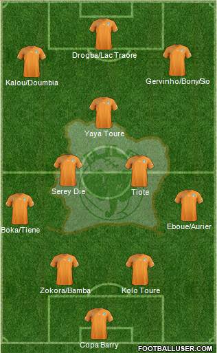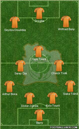 Barry · K. Toure · Bamba · Aurier · Boka · Zokora · Romaric · Y.Toure · Gervinho · Kalou · Drogba