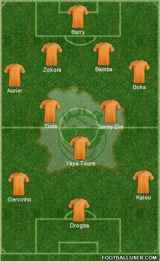 Barry · Toure · Zokora · Eboue · Boka · Yaya Toure · Tiote · Gervinho · Drogba · Kalou · Bony