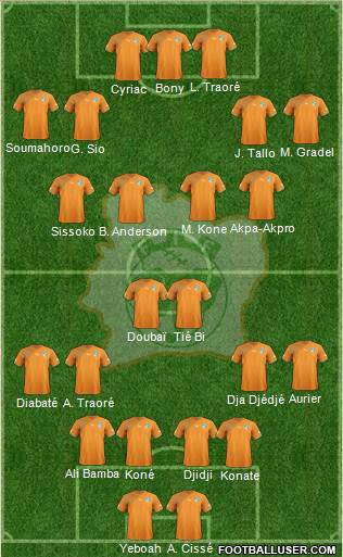 Gnanhouan · Viera · Angoua · Tiéné(Djedjé) · Aurier(Akpro) · Gosso · Serey Die · Razak · Doumbia(Sio) · Gradel(Kone) · Bony(Traoré)