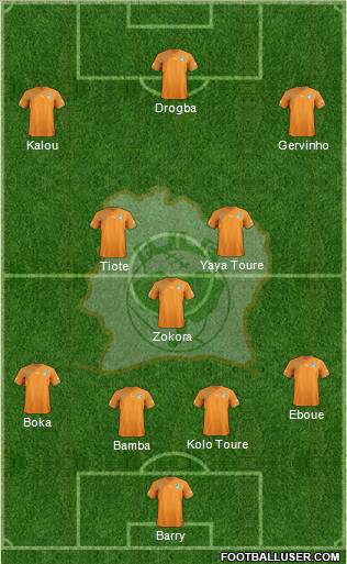 Barry · Angoua · Kolo Touré · Tiéné · Eboué · Romaric · Tioté · Yaya Touré · Kalou · Gervinho · Drogba