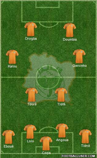 Copa # [1] · I. Lolo # [17] · K. Touré # [28] · E. Eboué # [21] · S. Tiené # [3] · C. Tioté # [15] · D. Zokora # [5] · Yaya Touré # [6] · Gervinho # [10] · S. Doumbia # [7] · D. Drogba # [11]