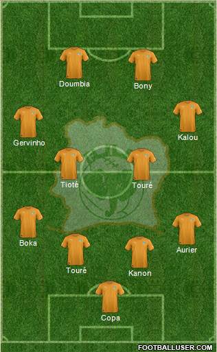 1. Boubacar Barry · 5. Didier Zokora · 22. Sol Bamba · 3. Arthur Boka · 17. Serge Aurier · 20. Serey Die · 9. Cheick Tioté · 19. Yaya Touré · 10. Gervinho · 8. Salomon Kalou · 12. Wilfried Bony