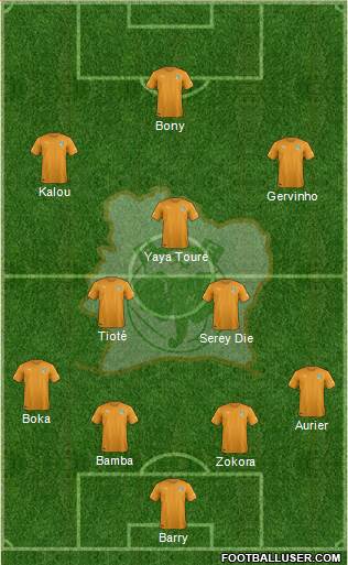 Barry · Aurier · Boka · Bamba · Zokora · Serey Dié · Tioté · Yaya Touré (c) · Gervinho · S.Kalou · Bony