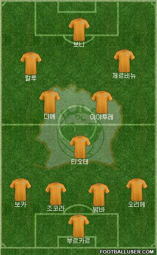 Barry · Zokora · Bamba · Boka · Aurier · Toure · Tiore · Die · Gervinho · Kalou · Drogba