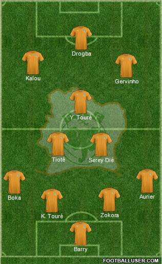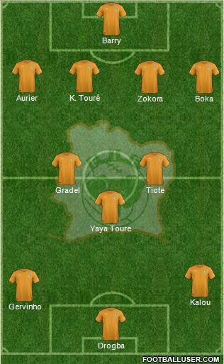 Barry · Kolo Touré · Zokora · Aurier · Boka · Tioté · Die · Yaya Touré · Gervinho · S. Kalou · Drogba