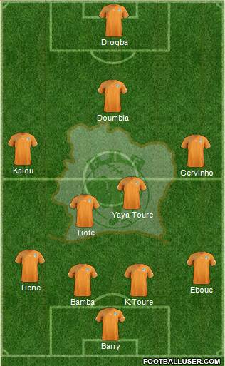 Barry · Kolo Toure · Bamba · Aurier · Boka · Serey Die · Tiote · Yaya Toure · Kalou · Gervinho · Drogba