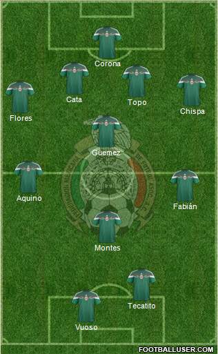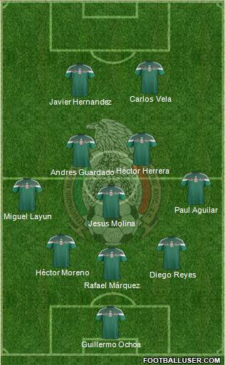 Memo Ochoa · Diego Reyes · Maza Rodriguez · Paul Aguilar · Miguel Layun · Gallito Vasquez · Jonathan · Andres Guardado · Hector Herrera · Carlos Vela · Dos Santos