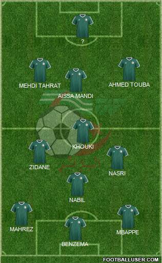 Ibrahim Maza (Chaibi / Himad Abdelli) · Bennacer (Aouar / Kadri) · Zerrouki (Kendouci / Boudaoui) · Ait nouri (Hadjam) · Weiser (Guitoun / Farsi) · Mandi (Tougai) · Bensebaini (Belaid / Touba) · Zeghba (Mandrea / Oukidja) · Amoura (Belaili / Brahimi) · Mahrez (Bouzok / Guitane) · Gouiri (Benzia / Bounedjah)