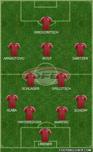 Arnautovic · Schlager · Lazaro · Sabitzer · Laimer · Grillitsch · Lainer · Alaba · Dragovic · Hinteregger · Strebinger