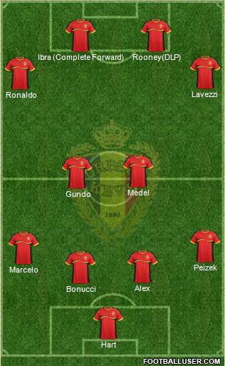 Courtois · Alderweireld · Vertonghen · Vermaelen · Kompany · Fellaini · Witsel · Defour · Hazard · De Bruyne · Benteke