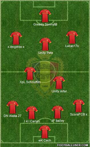 Courtois (Mignolet) · Kompany (Lombaerts) · Vermaelen (van Buyten) · Vertonghen (____) · Alderweireld (Gillet) · Fellaini (Defour) · Witsel (Nainggolan) · Hazard (Mertens) · De Bruyne (Chadli) · Dembele (Mirallas) · Benteke (Lukaku)