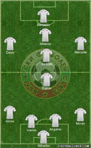 11. Dimitar BERBATOV · 20. Aleksandar TOMOV · 9. Ivelin POPOV · 17. Georgi MILANOV · 2. Stanislav MANOLEV · 18. Vladimir GADZHEV · 6. Yordan MINEV · 14. Veselin MINEV · 5. Nikolay BODUROV · 15. Ivan IVANOV · 13. Nikolay MIHAILOV
