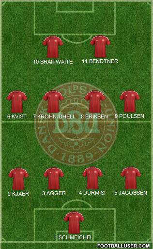 P.Schmeichel (1) · J.Vestergaard (1) · S.Kjaer (1) · S.Poulsen (2) · L.Jacobsen (1) · P.E.Højbjerg (2) · M.Krohn-Dehli (2) · C.Eriksen (1) · V.Fischer (2) · L.Schøne (2) · N.Jørgensen (1)