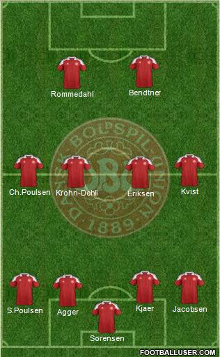 Andersen · Agger · Kjaer · Wass · Jacobsen · Rommedahl · Kristensen · Eriksen · Kvist · Krohn-Dehli · Bendtner