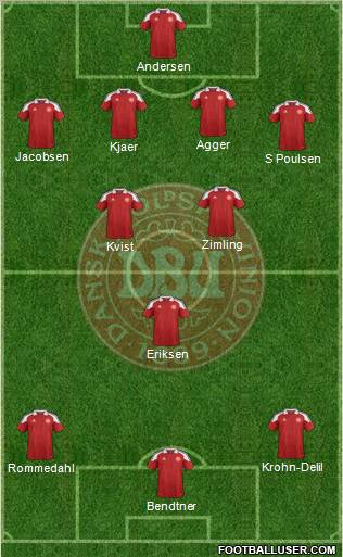Линдегор · Аггер · Кьер · С. Поульсен · Якобсен · Эриксен · Квист · Зимлинг · Крон-Дели · Роммедаль · Бендтнер