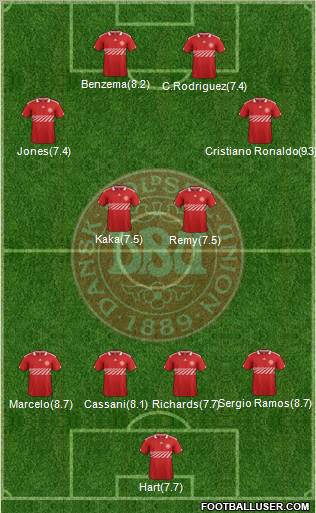 1 Anders Lindegaard · 3 Bjelland · 4 Agger · 6 Jacobsen · 5 Boilesen · 7 Kvist · 2 Zimling · 9 Krohn-Dehli · 10 Rommedahl · 8 Eriksen · 11 Bendtner