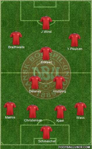 Schmeichel · Kjaer · Christensen · Vestergaard · Delaney · Hojbjerg · Maehle · Larsen · Damsgaard · Braithwate · Dolberrg
