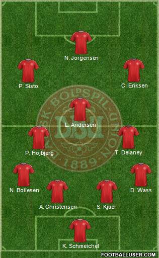 Schmeichel K. · Kjær · Mat. Jørgensen · Knudsen · Dalsgaard · Delaney · A. Christensen · Schöne · Eriksen · Braithwaite · Y.Poulsen · Cornelius · N. Jørgensen