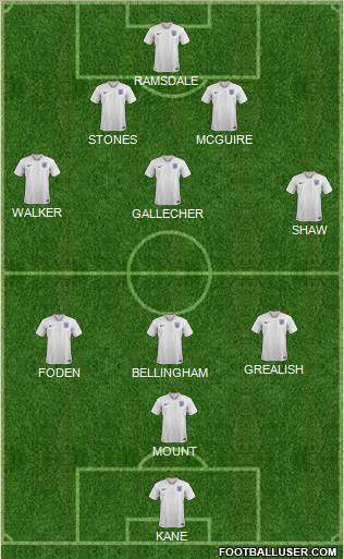 Ramsdale [Arsenal] · Stones [Man City] · Maguire [Man Utd] · Shaw [Man Utd] · Alexander [Liverpool] · Rice [Arsenal] · Foden [Man City] · Bellingham [Real Madrid] · Saka [Arsenal] · Grealish [Man City] · Kane [Bayern]