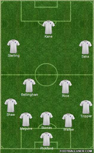Pickford · Stones · Maguire · Trippier · Walker · Rice · Phillips · Foden · Bellingham · Rashford · Kane