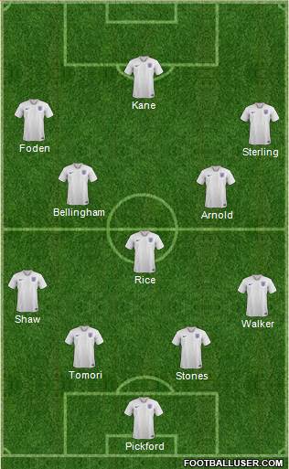 Pickford · Walker · Stones · Guéhi · Saka · Rice · Tripper · Mainoo · Bellingham · Foden · Kane