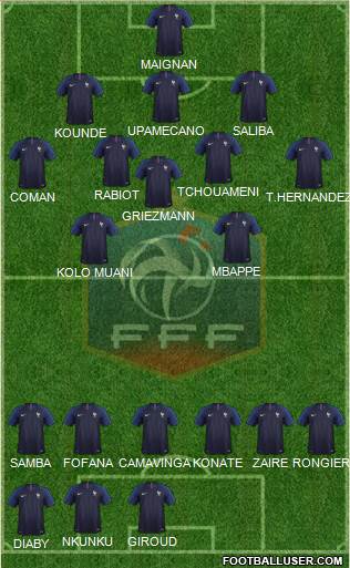 M.Maignan · W.Saliba · L.Hernandez · T.Hernandez · B.Pavard · A.Tchouaméni · E.Camavinga · A.Rabiot · A.Griezmann · K.Mbappé · J-M.Sierra (C)