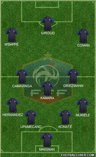 MAIGNAN · UPAMECANO · SALIBA · KOUNDÉ · T.HERNÁNDEZ · TCHOUAMÉNI · CAMAVINGA · GRIEZMANN (c) · KOLO MUANI · DEMBÉLÉ · MBAPPÉ